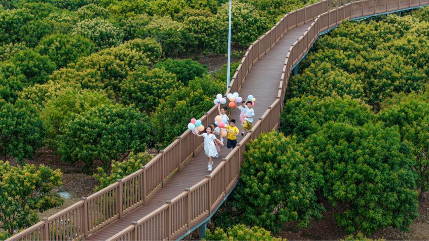 在茂名高州,游客漫步根子公园空中栈道,共赴春天的诗约。谭世聪/拍摄