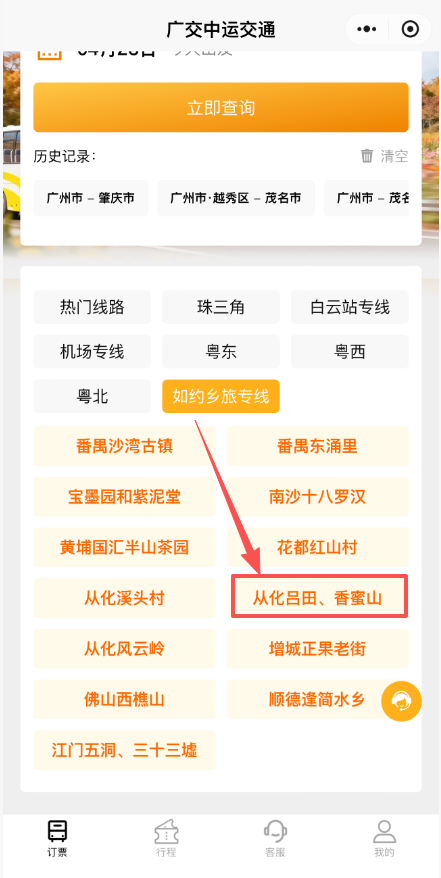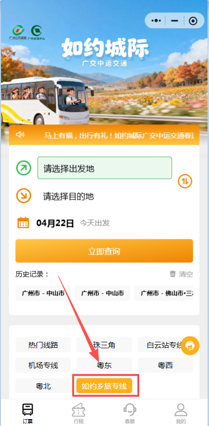 关注“广交中运交通”公众号,点击菜单栏“购买车票”处进入购票页面